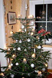 Hat sich der Baum erholt und an die wärmeren Temperaturen gewöhnt, kann er ins Wohnzimmer kommen. Meist ist er noch genetzt, was das Aufstellen im Wohnzimmer erleichtert. Das Netz sollte man von unten nach oben aufschneiden, so verletzt man keine Zweige oder Nadeln. Am besten stellt man den Baum bereits einen Tag vor dem Schmücken im Wohnzimmer auf, damit der Baum genug Zeit hat, wieder seine natürliche Position einzunehmen. Das erleichtert das Schmücken.