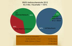 Laut einer vom Bundesverband der Weihnachtsbaum- und Schnittgrünerzeuger in Auftrag gegebenen repräsentativen Verbraucherstudie standen zum Fest 2012 – 21,32 Millionen natürliche Weihnachtsbäume in deutschen Privathaushalten. Rechnet man die vom öffentlichen und gewerblichen Bereich aufgestellten großen und kleinen Dekobäume hinzu, wurden 2012 in Deutschland insgesamt rund 23 Millionen natürliche Weihnachtsbäume aufgestellt.